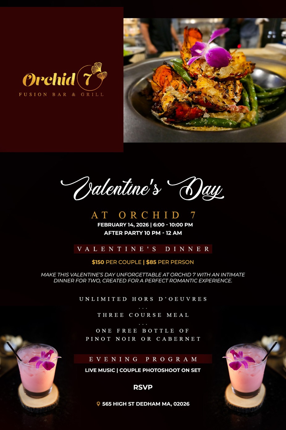 Enjoy a romantic evening at Orchid7 with a specially curated pre-fixed menu that promises to delight your taste buds. Immerse yourself in the soulful melodies of live music and indulge in our unique and memorable specialty cocktails for an experience to remember. Then Unwine with a DJ TBN for Unwine Saturday!