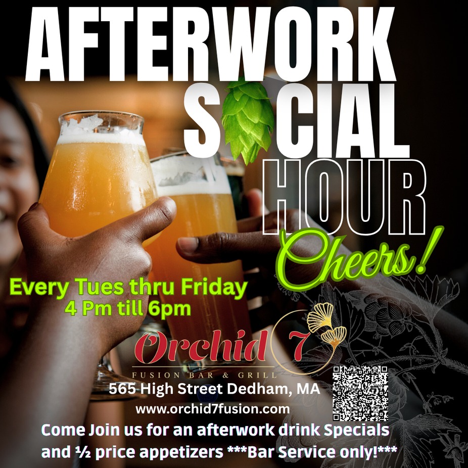 Unwind and relax after a long day at Orchid7 Fusion Bar & Grill's Afterwork Social Hour, where vibrant Caribbean flavors meet a lively, inviting atmosphere. Join us every Tuesday through Friday from 4 PM to 6 PM for an experience that blends delicious food, refreshing drinks, and the irresistible rhythms of the Caribbean. Indulge in our special selection of appetizers, crafted to tantalize your taste buds and perfectly complement our drink specials. Whether you're in the mood for a classic cocktail or a tropical twist, our expertly mixed drinks are sure to delight.