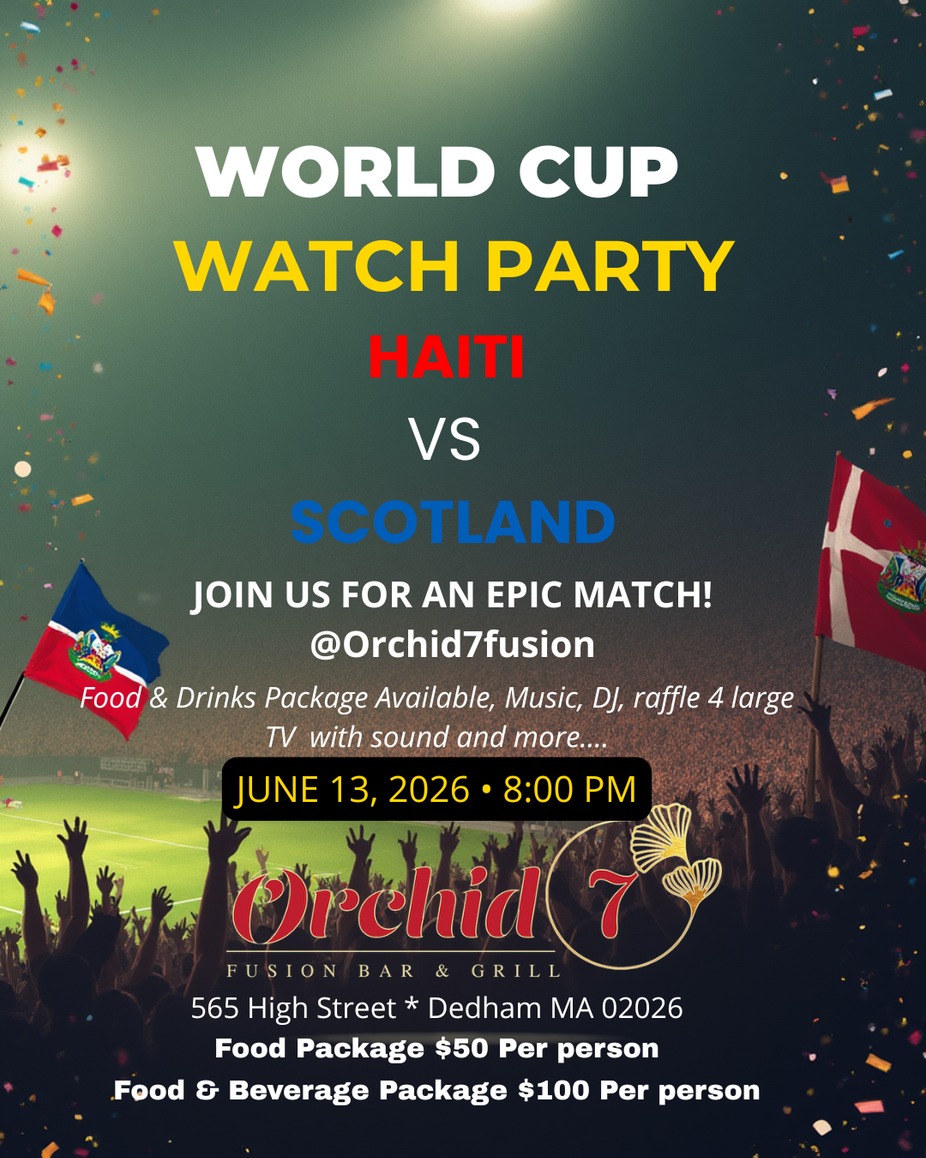 Please join us to watch Haiti compete against Scotland here in Foxboro. Additionally, at Orchid7 Fusion Bar & Grill, we will be hosting tailgating events in Dedham Square for every game.
